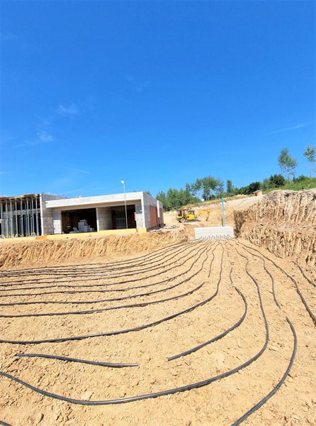 În zonele rurale, unde aplicația beneficiază de un teren generos (aprox. 750mp teren pentru sursa aferent unei case moderne de 220mp), se pot monta serpentinele pe orizontală, în pământ, la o adâncime de 1,5-2m. În acest caz, conductele de PE80 D40 PN6 vor fi similare unui circuit de încălzire în pardoseală, de tip dus-întors, la o distanță (pas) de 1m. Circulă același tip de agent prin acestea, antigel geotermal. Este o soluție foarte bună acolo unde terenul permite întrucât costurile de realizare scad la jumătate față de soluția cu sonde pe verticală.