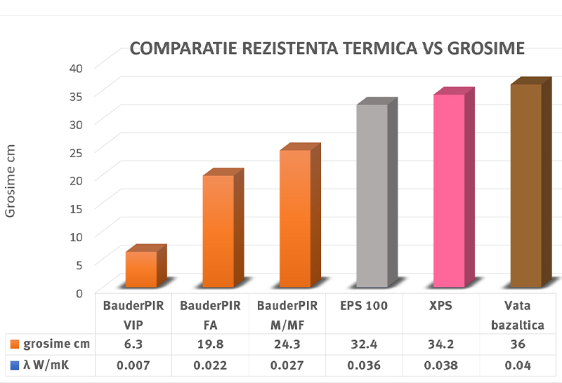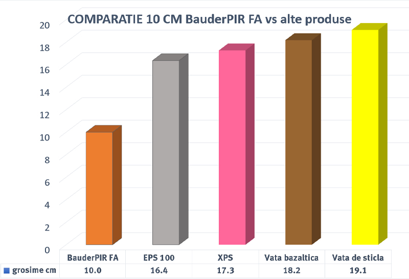 O comparație între grosimile necesare pentru a atinge o valoare de U de 0,11 W/m2 K arată clar avantajul BauderPIR: în timp ce alte materiale necesită straturi mai groase, o placă BauderPIR FA de 10 cm oferă aceleași performanțe într-un strat mult mai subțire, contribuind la un design mai eficient și mai economic.